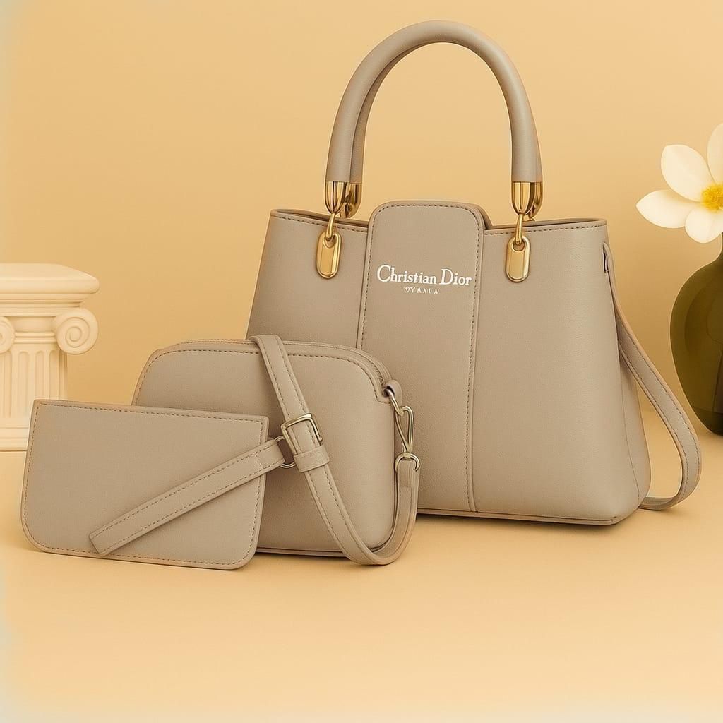 This is a beautiful Christian Dior brown bag set, featuring a large handbag, a smaller crossbody bag, and a cardholder. They all look very stylish with golden hardware accents.