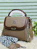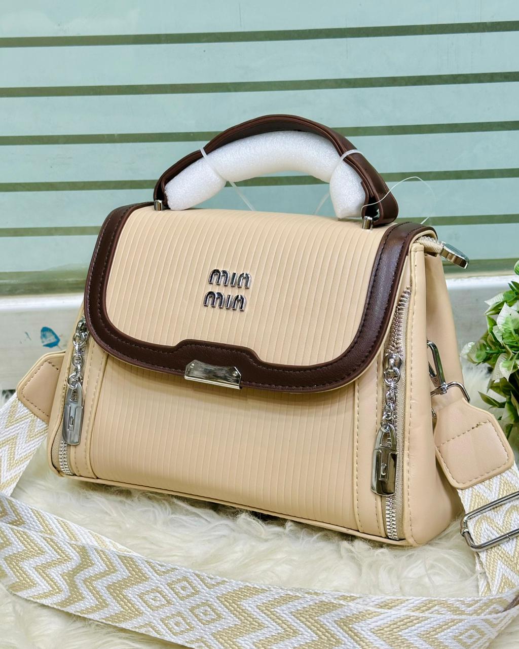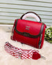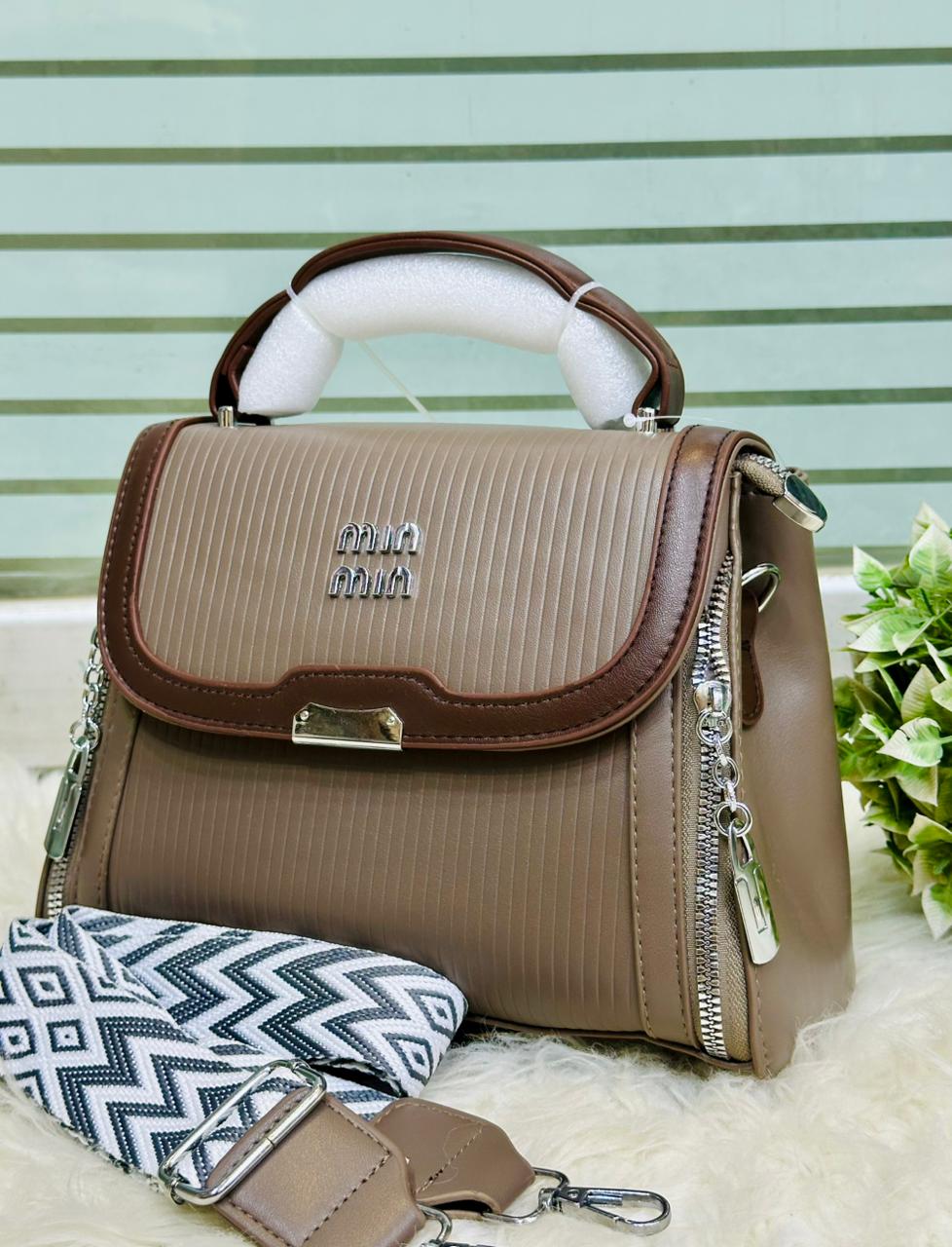 ✨ Size : Medium This is a vibrant red top-handle bag with a structured silhouette and a textured, pleated design on the front panels. It features dark brown leather-look trim, silver-tone hardware including a "MIU MIU" logo, and decorative zippers on the sides. The bag comes with a detachable, wide strap in a red and white geometric pattern, offering a stylish and versatile look.